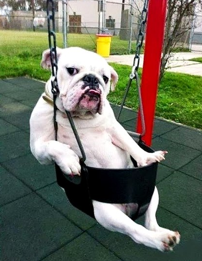 Bulldog is sitting on a swing looking so serious and like he is trying to flirt with you