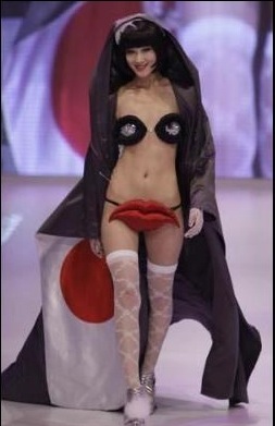 What will these designers think of next? This girl really looks pretty sad with the bikini bottom lips. Pretty funny outfit! I'll never get it.