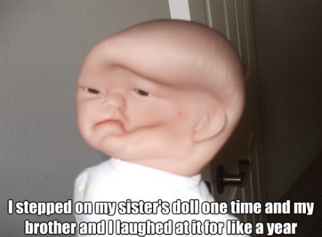 I stepped on my sister's doll one time and my brother and I laughed for like a year. Now this is the funniest doll ever. Looks a little bit like uncle fester's baby.