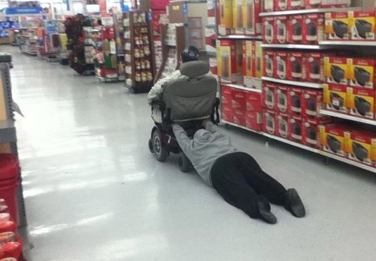 The guy is dragging down the aisle in the back of a scooter at Walmart