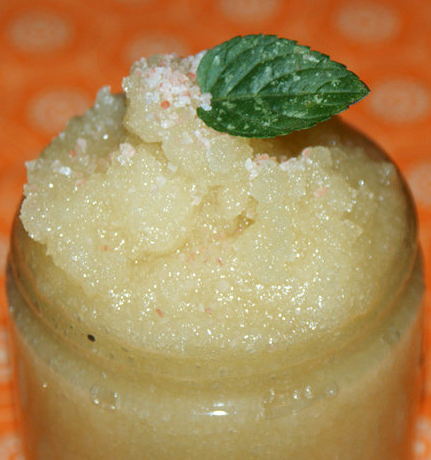 Salt or sugar can be used, but sugar is gentler on the skin, just choose a sugar or salt that has small granules that won't tear at skin. A basic table salt or sugar works wonderfully, as well.If you have super sensitive skin, you might use a dark brown sugar.