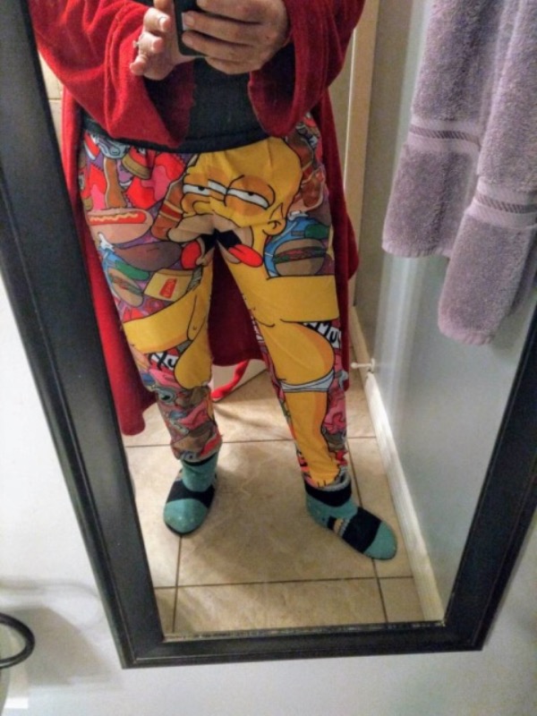 Homer puts a hot dog in his mouth and they placed it perfectly in her pants.