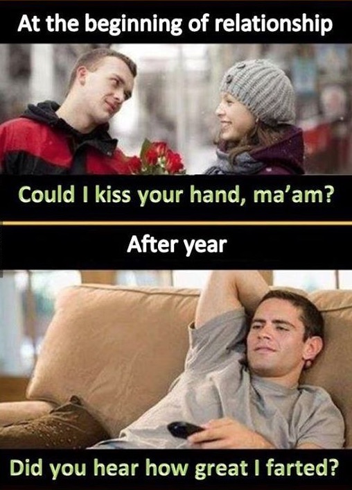 At the beginning of relationship: Could I kiss your hand ma'am? After year: Did you hear how great I farted.