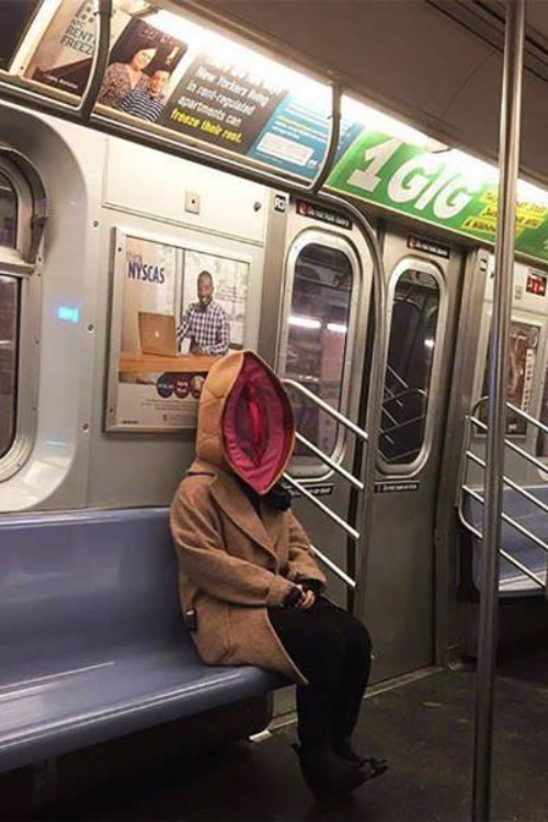 This coat is probably going to get you a lot of attention. The subway must be completely empty because normally guys would be flocking to her.