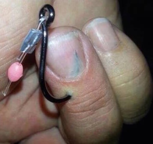 Ouch this has to hurt. Somebody get this person to the emergency room. No idea how they can get a hook out with that crazy point facing the other way. Might have to saw it off.