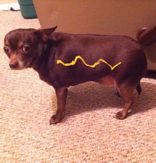 This poor little dog is going to get eaten if he doesn't watch out. He's got all the trimming of a hot dog. All he needs is a little relish.