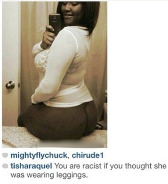 I'm thinking these are leggings but I don't know for sure. What do you think? Are you racist or not? It's very hard to tell. She might have leggings that totally match her skin.