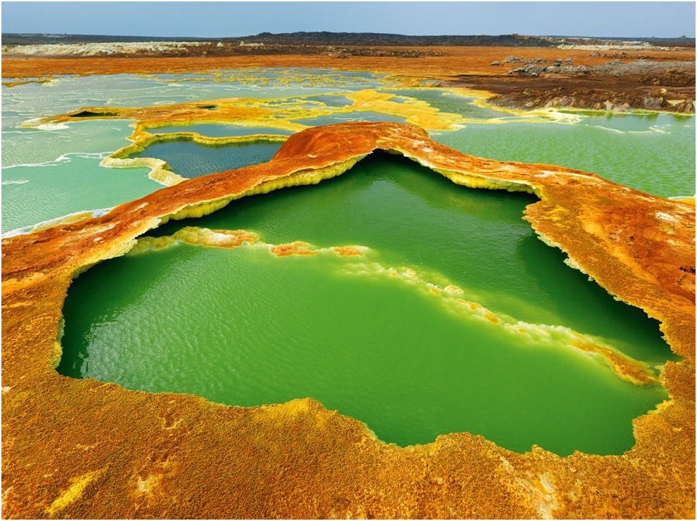 Sulfur and algae turn hot springs into pools of living color. The water is condensation from hot gases rising from magma chambers. As the water evaporates, salts and minerals form a vivid crust.