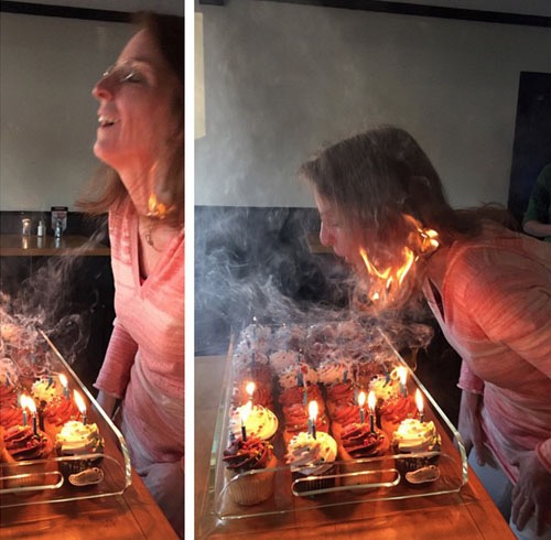 I hope she saved a wish because she's going to need a few more at the hospital. When your hair catches fire are you still supposed to roll on the ground?