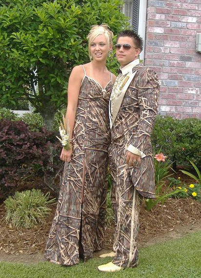 Going to a pome is a big deal for a lot of couples and you really want to stand out from the crowd, but not this couple they got matching camouflage outfits to blind in in the crowd.