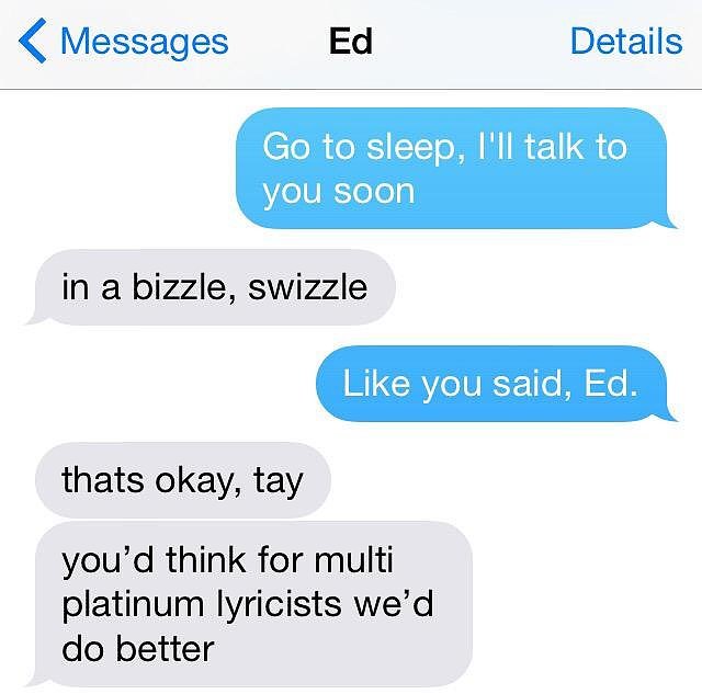 Can their friendship be anymore perfect? Taylor shared this screenshot of their texts on May 2015, joking, "Never not rhyming with @edsheeran ."
