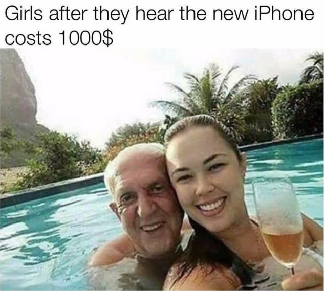 Girls after they hear the new iPhone costs $1000. Grandpa becomes there new best friend! Let's toast in the pool to our new expensive phone!