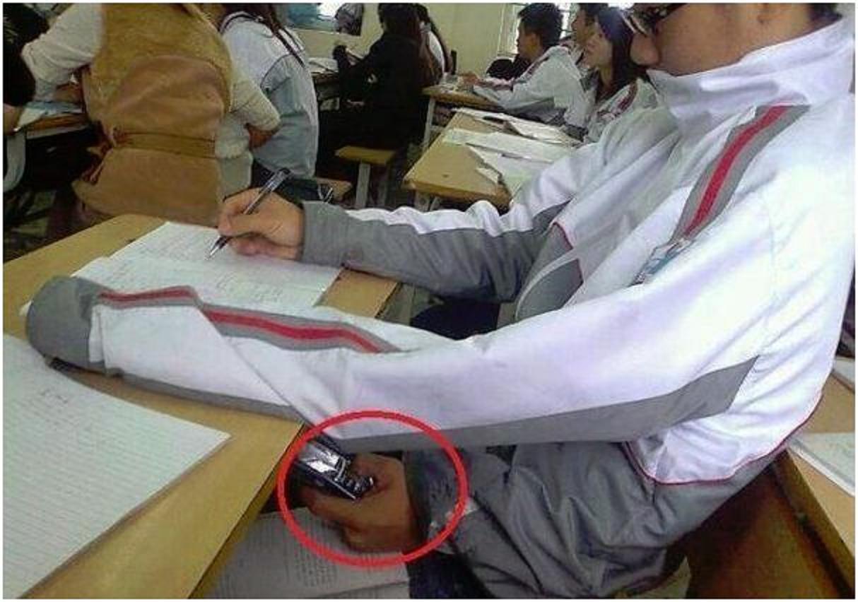 Cheating on tests has been around since school was created but when cellphones came in play cheating just got even better make sure that you wear something with long sleeves then pull your hand out of one sleeve and put the sleeve on a table to make it look like you have 2 of your hands on the table but sneak your hand down the shirt and text to your friends and see if they know the answers