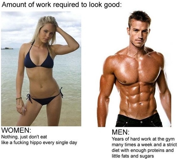 As if refraining from eating like a hippo is enough. Women do work hard too you know!