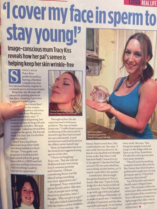 I cover my face in sperm to stay young! Image conscious mum Tracy Kiss reveals how her pal's semen is helping keep her skin wrinkle free.