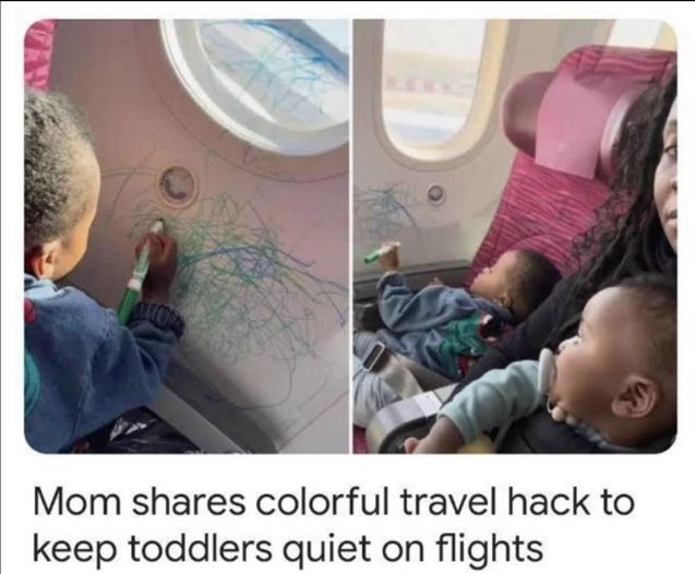 Mom shares a colorful travel hack to keep toddlers quiet on flights. This works great!
