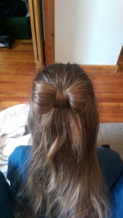 This is how you create a bow on top of your head. Now all you have to do is learn how to put your arms in back of your head while looking in the mirror!
