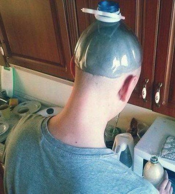 If you are bald or just shave your head now you too can have a ponytail. Just follow this girl's instructions. Cut a big bottle in half and place it on your head.