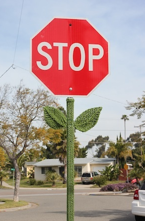 Theres a lady on my street she always complaines acout how teanagers run the stop sign so she made it more noticeable it looks like a big flower now.