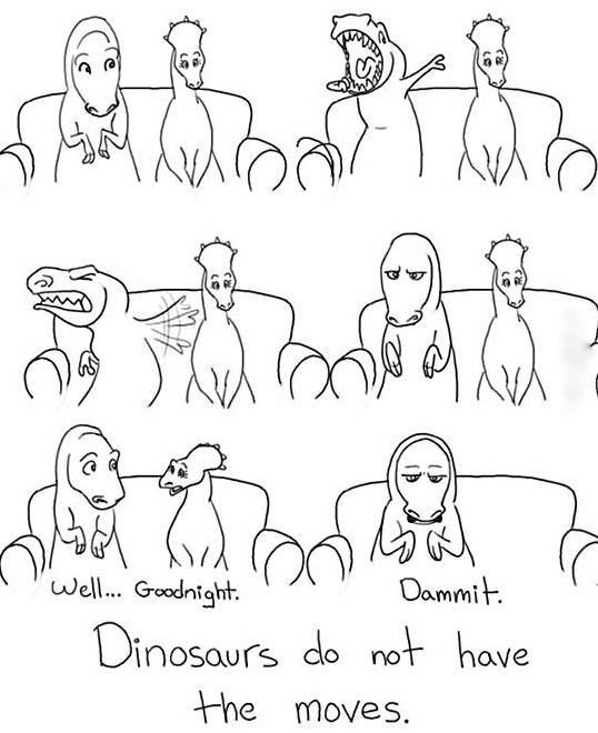 Dinosaurs Do Not Have the Moves! Those short arms get you every time. Next time try necking or something. It's not easy being a T-Rex.