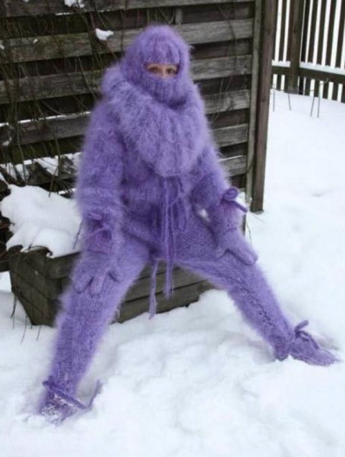 If you are wondering how to stay warm this winter why not get a purple angora suit. There won't be an ounce of cold on you.