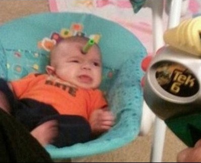 I don't think this baby saw this coming. Poor little guy has a dart right on his forehead. Somebody take it off before he starts crying again!