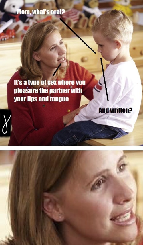 Mom, what's oral? It's a type of sex where you pleasure the partner with your lips and tongue. And written? I think mom just goofed...