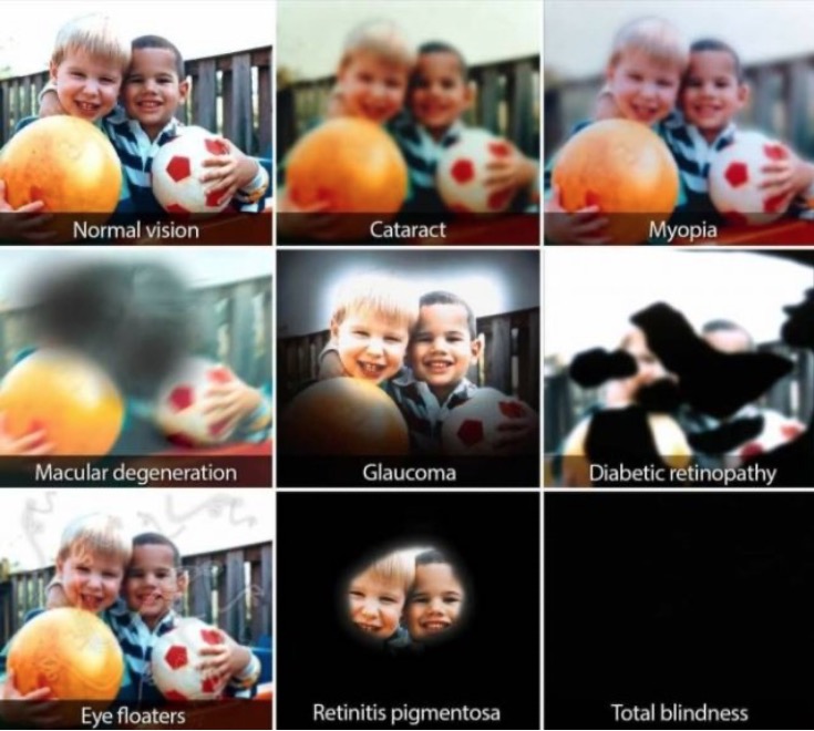 How you see with normal vision, cataracts, myopia, macular degeneration, glaucoma, diabetic retinopathy, eye floaters, retinitis pigments, total blindness.