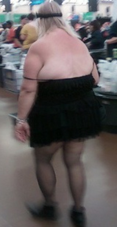 The black bandana is a really nice touch too. That dress is so low cut I can't imagine what it looks like when she turns around. Yikes!