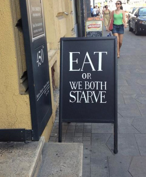 This guy has a sign outside his restaurant that says "eat or we both starve" I appreciate the honesty of this guy