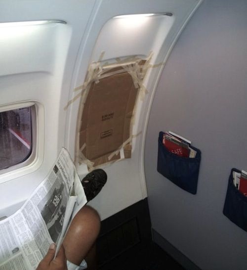Wow this is scary! I hope there is a window on the other side of that cardboard. I don't think the plane will be able to pressurize without it...