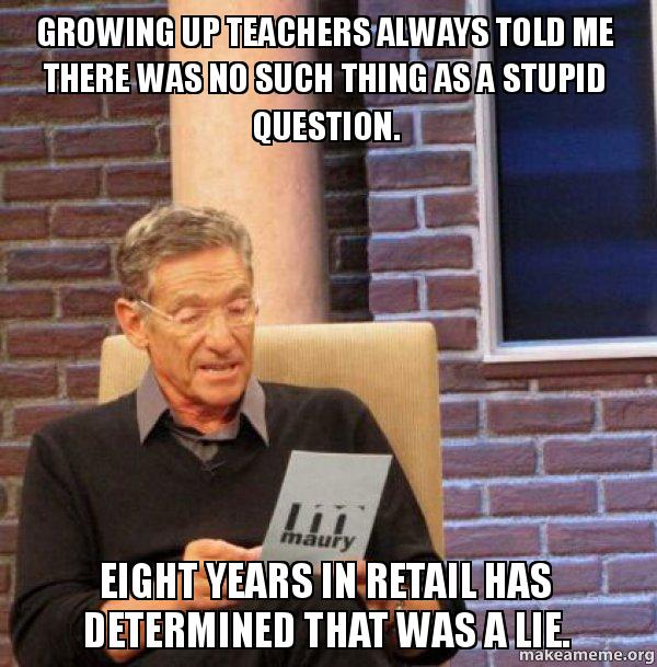 Okay first of all the sentence should have had a comma after growing up because there are "growing up teachers", I bet there are "growing down teachers" as well. Secondly, yes, buyers do have some really stupid questions to ask but I do believe that this happened at Walmart. Don't believe me then check out the other faxo images that are full of Walmart buyer's fashion fails. I bet you would agree. Hahahahhahhahahahahahahahahaah!!!!!!!!