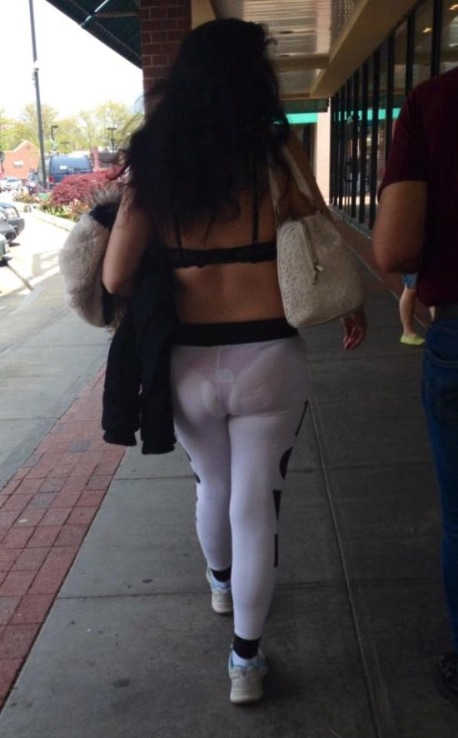 This girl really needs to stop and reevaluate what she's wearing. First mistake was wearing leggings, second mistake was making them see through, and last mistake was wearing a pad with wings and a thong