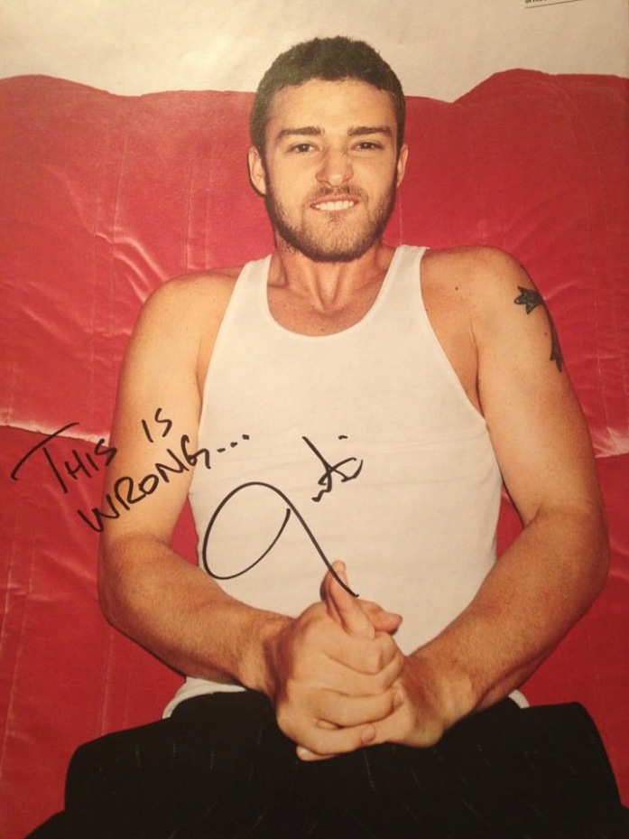 Justin Timberlake signed his picture. The signature goes perfect with the picture! It looks like Justin is having too much fun with his hands!