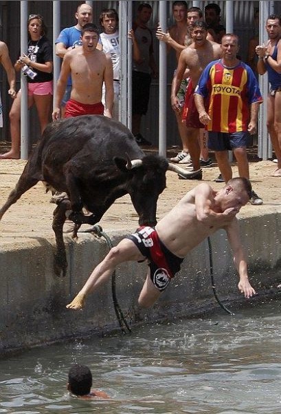 I Hope the Bull Can't Swim! Bull Chases Guy into Water - Running of Bulls Horns
