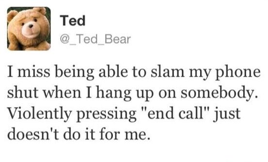I miss being able to slam my phone shut when I hang up on somebody.... violently pressing "end call" just doesn't do it for me.