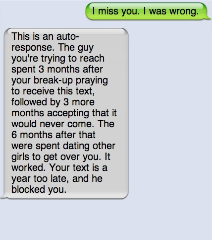 This is an auto-response. The guy you're trying to reach spent 3 months after you break-up praying to receive this text, followed by 3 more months accepting that it would never come. The 6 months after that were spent dating other girls to get over you. It worded. Your text is a year too late, and he blocked you.