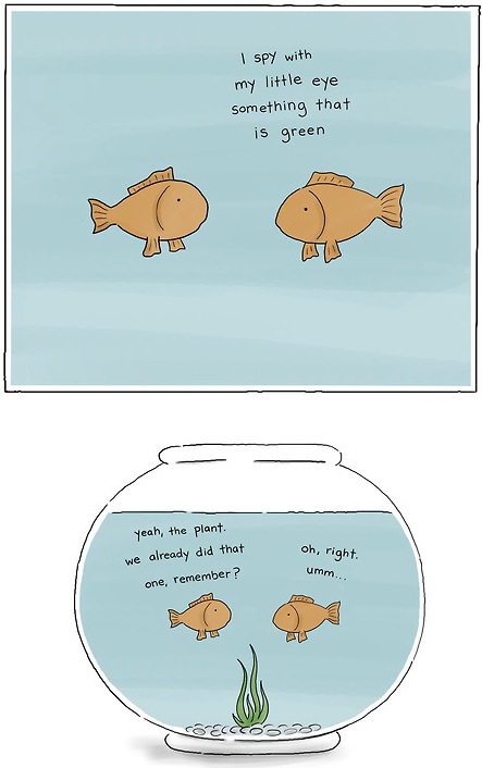 I spy with my little eye something that is green. Yeah the plant we already did that remember? Oh, right. Ummm... Looks like these little fishes are running out of ideas for their game!