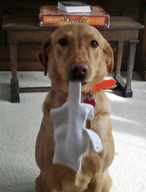 I think my dog is mad at me. Why else would she give me the finger? FU owner! LOL. Then again maybe she is playing fetch with this glove?