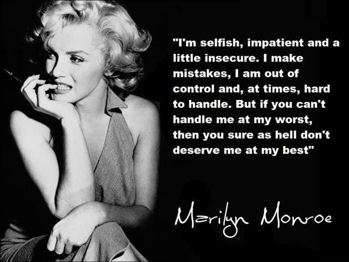 I'm selfish, impatient and a little insecure. I make mistakes, I am out of control and at times hard to handle. But if you can't handle me at my worst then you sure as hell don't deserve me at my best - Marilyn Monroe