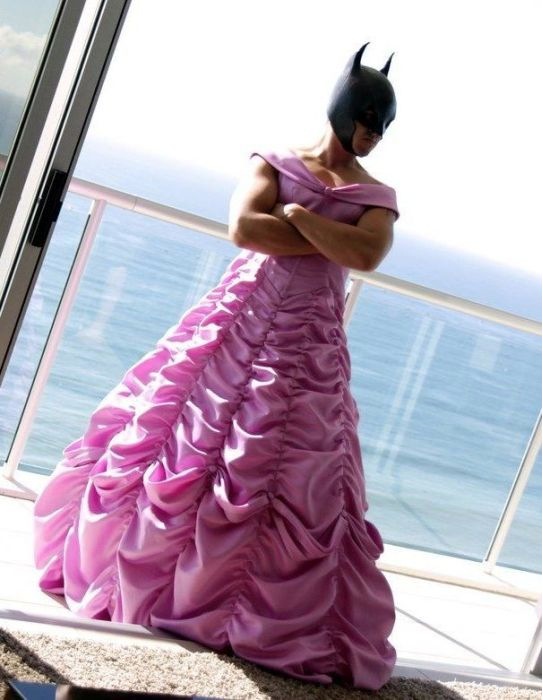 Ok what is batman doing in a dress? You would think he would look ridiculous but he doesn't look too bad. He looks quite good!