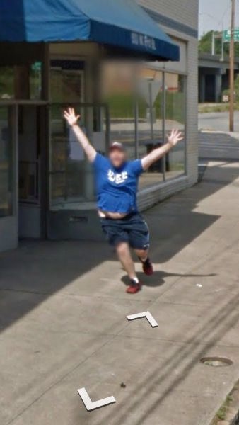 Imagine being in the picture of a google maps street view? It would be kind of scary to be gliding along and seeing this crazy guy coming at you.