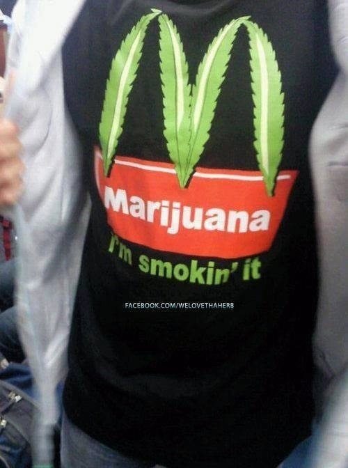 A funny play on the popular McDonald's tag line. Instead of McDonald's, I'm lovin' it, it's become Marijuana, I'm smokin' it.