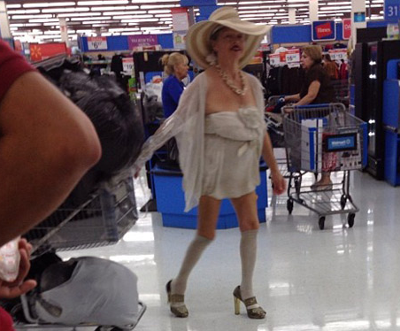 Walking down to the checkout line this woman that looks like she has a man's mustache is just wearing clothes that I don't think belong to her.
