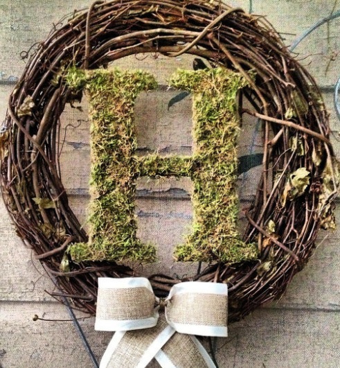 Make your own wreath by gathering long twigs from the woods or buy your own wreath. Decorate it with the first letter of your first or last name and place it in the middle with wire. Finish it with a bow and hang.