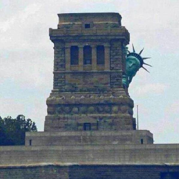 The statue of liberty is hiding behind her pedestal hoping hurricane sandy is gone