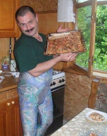 Italian man is in the kitchen right where he supposed to be, by the looks of his pants he likes being there.