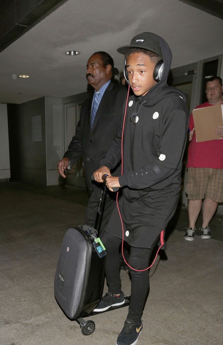 Jaden Smith keeps his headphones on while arriving at LAX airport for a flight out of town on Monday in Los Angeles.