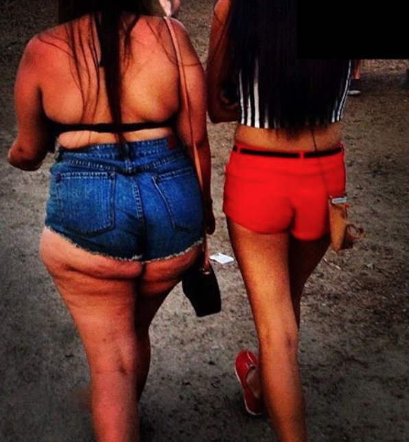 Looks like there is no bottom to these jean shorts. She's walking around al fresco. There seems to be no end to how short they make their shorts!