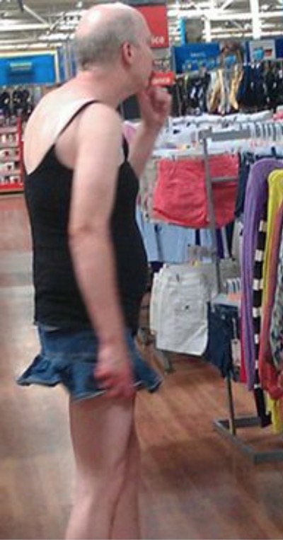 This looks more like a jean skirt tutu. Maybe grandpa is part ballerina? That short tutu shoes of his legs and his bald head. The camisole really tops it off.